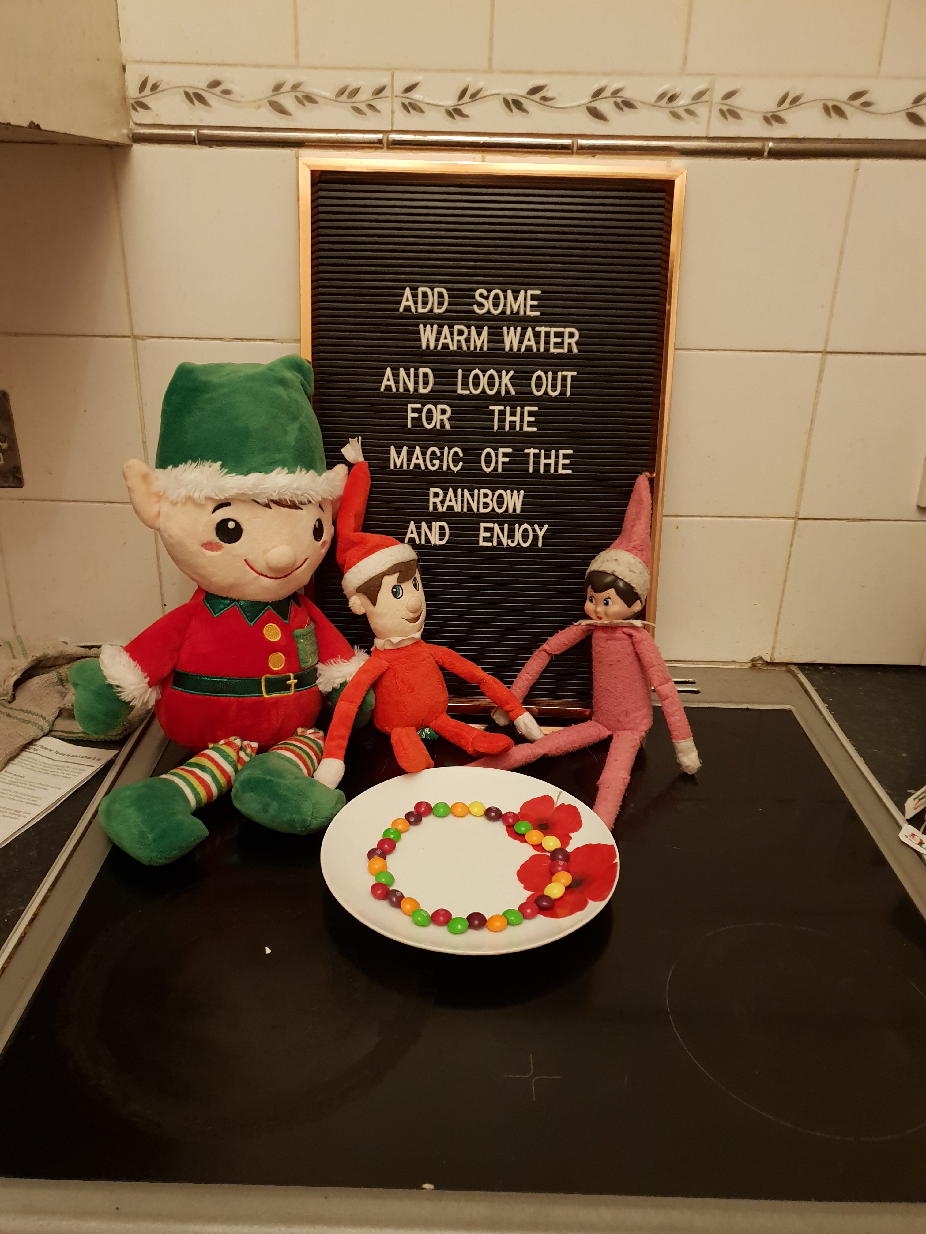 Over the last few nights they have gone back to their mischeious ways causing havoc such as eating all the christmas chocolates, attempting to sneak into Megan’s school bag so they could go to school thinking we wouldn’t catch them in the act. This week they have managed to get tangled in our airbed hose and they thought it would be funny to get all Georgie’s soft dough and cutters out to play with…..But bless the magic of the elves everyday is just fantastic. Got some good ideas hopefully for the last few weeks of having the elves in our home.
